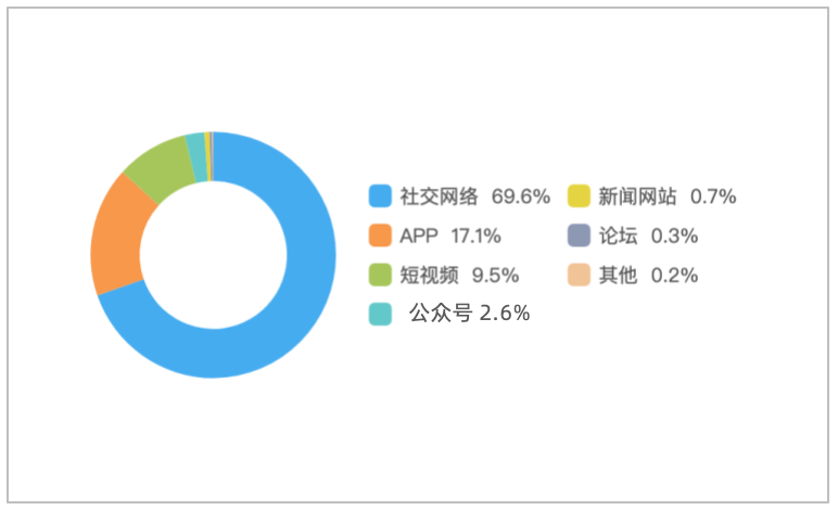 该时段内,境内有关“重庆一大学老师被指刻薄魅男”的舆情主要集中在社交网络平台,相关舆情量约占总量的69.6%,其次为新闻APP约占17.1%,短视频约占9.5%。