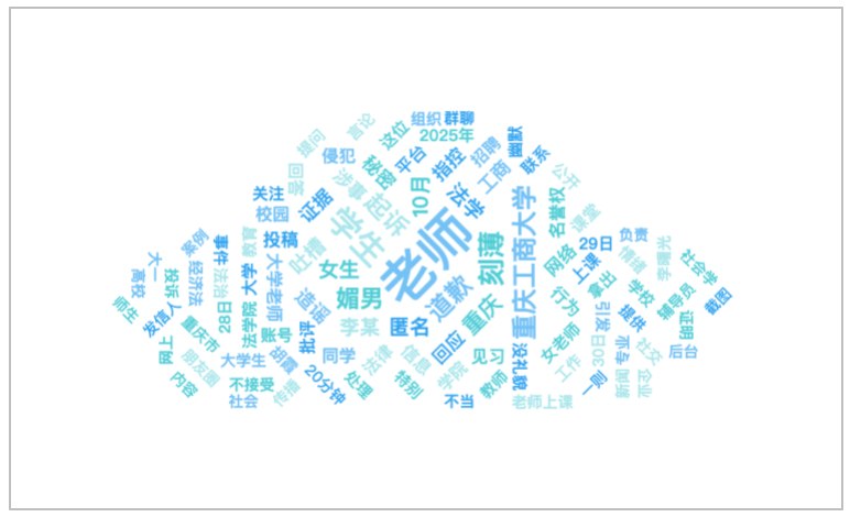 该时段内,有关“重庆一大学老师被指刻薄魅男”的话题提及频次较高的词语有“老师”、“学生”、“刻薄”、“重庆工商大学”、“道歉”等。