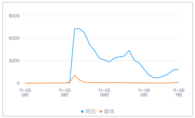 该时段内,境内有关“神舟二十号返回任务将推迟进行”的舆情信息,媒体舆情于11月05日10时达到最高峰,网民舆情于11月05日10时达到最高峰。
