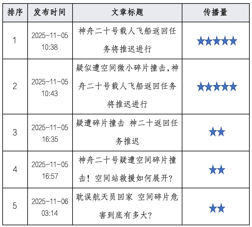 (一)关注神舟二十号返回任务推迟原因及官方应对  据新京报、新闻晨报、封面新闻报道 中国载人航天工程办公室宣布,原定于11月5日实施的神舟二十号返回任务因飞船疑似遭空间微小碎片撞击而推迟。目前正在进行影响分析和风险评估,以确保航天员安全和任务成功。所有报道均强调官方对航天员生命健康的高度重视,推迟决定基于严谨的科学评估程序,未透露具体撞击细节,但表明这是中国载人航天工程首次因碎片撞击推迟返回任务。