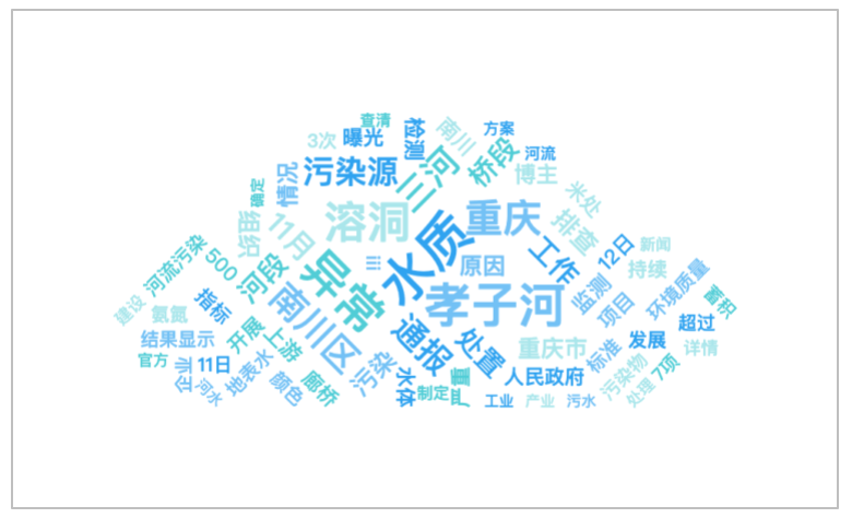 该时段内,有关“重庆一河流污染严重”的话题提及频次较高的词语有“水质”、“孝子河”、“异常”、“溶洞”、“重庆”等。