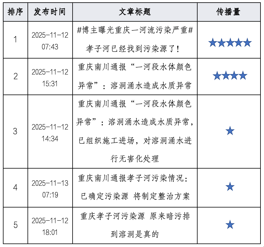 2025年11月12日00时至2025年11月13日16时,境内有关“重庆一河流污染严重”的舆情信息主要传播平台为短视频、新闻APP、微信等。总体情感倾向以中性为主。其中,中性信息约占56.2%;负面信息约占32.5%;正面信息约占11.3%。舆情在11月12日达到最高峰。