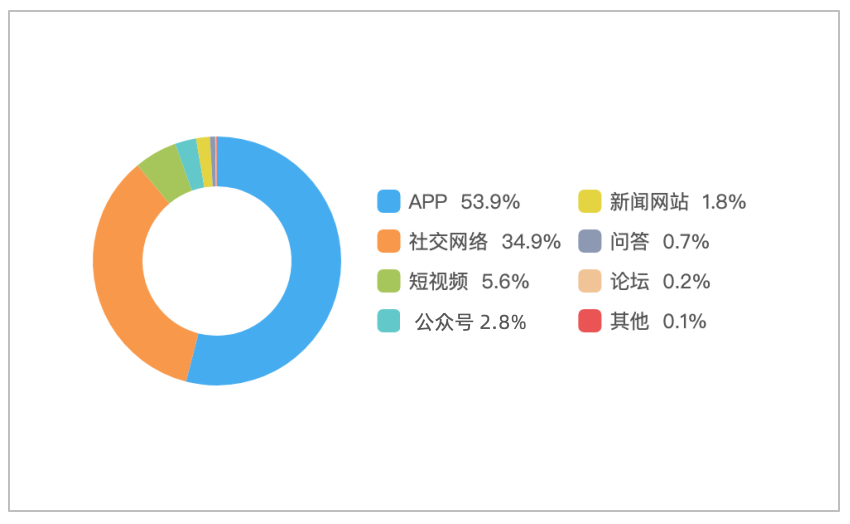 该时段内,境内有关“江苏科技大学博导被指履历造假”的舆情主要集中在新闻APP平台,相关舆情量占总量的53.9%,其次为社交网络占34.9%,短视频占5.6%。