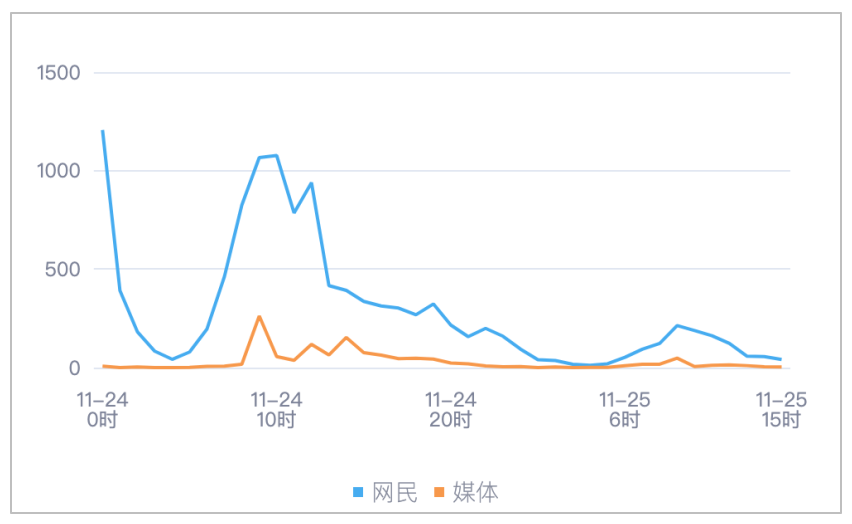 该时段内,境内有关“彝族老人在凉山公益列车上遭围拍”的舆情信息,媒体舆情于11月24日09时达到最高峰网民舆情于11月24日00时达到最高峰。