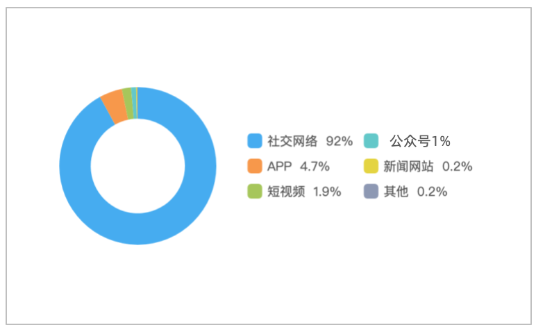 该时段内,境内有关“多所高校停招外语专业”的舆情主要集中在社交网络平台,相关舆情量占总量的92%,其次为新闻APP占4.7%,短视频占1.9%。