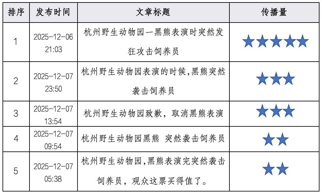 (一)关注事件经过与官方回应据【澎湃新闻】、【新快报】、【红星新闻】报道,2025年12月6日15时50分左右,杭州野生动物世界在动物行为展示期间发生意外。一只名为“熊二”的黑熊在表演待场时,突然两次扑向身旁的驯养员。现场目击者拍摄的视频显示,多名工作人员迅速使用凳子、杆子等工具合力将黑熊与饲养员分开,过程惊险,导致表演紧急中止。事件发生后,园方及富阳区人民政府工作人员均迅速回应,确认被袭击的饲养员身体无碍,动物园正常营业,但涉事的欢乐剧场暂停开放。官方通报将事件定性为黑熊因争抢驯养员携带的食物所致,并强调人与动物均未受伤,试图平息公众的恐慌情绪。