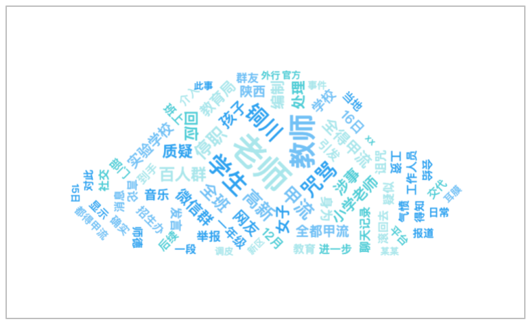 该时段内,有关“陕西一小学老师咒骂全班得甲流”的话题提及频次较高的词语有“老师”、“教师”、“学生”、“铜川”、“咒骂”等。