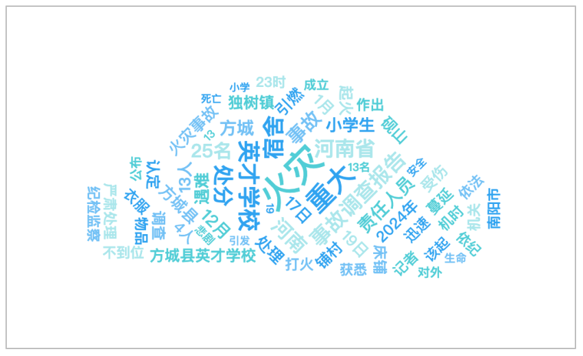 该时段内,有关“河南方城学校火灾25人被处分”的话题提及频次较高的词语有“火灾”、“重大”、“英才学校”、“宿舍”、“处分”等。