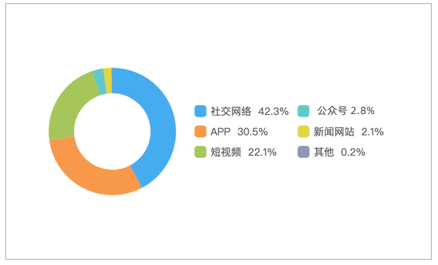 该时段内,境内有关“中华书局下架召回唐诗三百首”的舆情主要集中在社交网络平台,相关舆情量约占总量的42.3%,其次为新闻APP占30.5%,短视频占22.1%。
