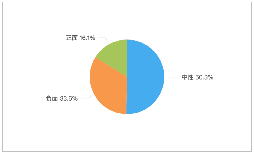 该时段内,境内有关“中华书局下架召回唐诗三百首”的舆情情感倾向中,中性舆情占比最多,达到50.3%;其次是负面舆情,占比33.6%;正面舆情占比较少,仅为16.1%。