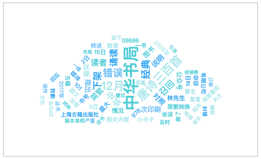 该时段内,有关“中华书局下架召回唐诗三百首”的话题提及频次较高的词语有“中华书局”、“唐诗三百首”、“12月”、“错误”、“经典”等。