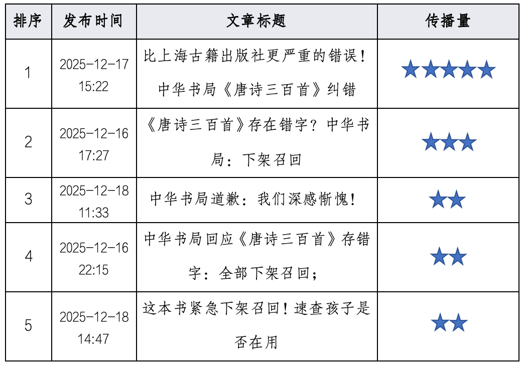 (二)聚焦古籍出版行业普遍存在的信任危机据【人民文娱】、【第一时间】、【新京报】报道,舆论认为中华书局《唐诗三百首》事件并非孤例,而是当前古籍出版领域质量下滑的缩影。人民文娱将此事与近期上海古籍出版社《西厢记》被指存在大量错误的事件并列,指出“古籍出版物内容错误再引关注”。第一时间评论则犀利地指出,这些事件串联起一个“残酷现实:古籍出版正经历‘信任危机’”。新京报也提及上海古籍出版社同样“脸上挂不住”出来检讨,表明这已成为行业性现象。该观点集群认为,多家以严谨著称的老牌出版社接连“翻车”,严重消耗了读者和学界对古籍整理本的信任基础,动摇了其作为学术研究可靠依据的权威地位。