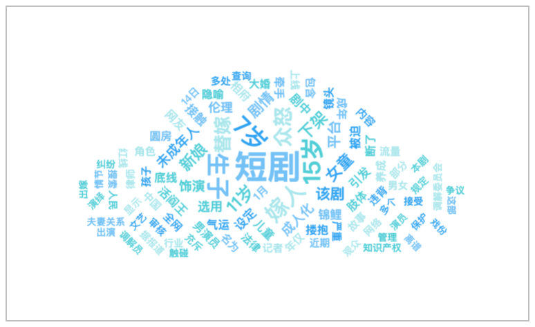 该时段内,有关“短剧选用11岁女童演替嫁新娘”的话题提及频次较高的词语有“短剧”、“7岁”、“15岁”、“生子”、“嫁人”等。