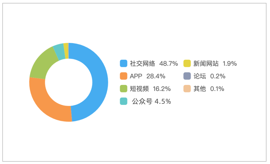 该时段内,境内有关“大连一交通事故致5人死亡”的舆情主要集中在社交网络平台,相关舆情量约占总量的48.7%,其次为新闻APP约占28.4%,短视频约占16.2%。
