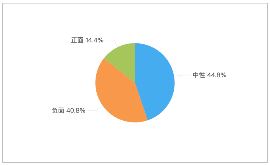 该时段内,境内有关“大连一交通事故致5人死亡”舆情情感倾向以中性为主,约占比44.8%;负面舆情次之,约占比40.8%;正面舆情较少,约占比14.4%。