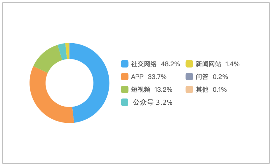 该时段内,境内有关“浙江夫妻网购娃娃菜食用中毒事件”的舆情主要集中在社交网络平台,相关舆情量约占总量的48.2%,其次为新闻APP约占33.7%,短视频约占13.2%。