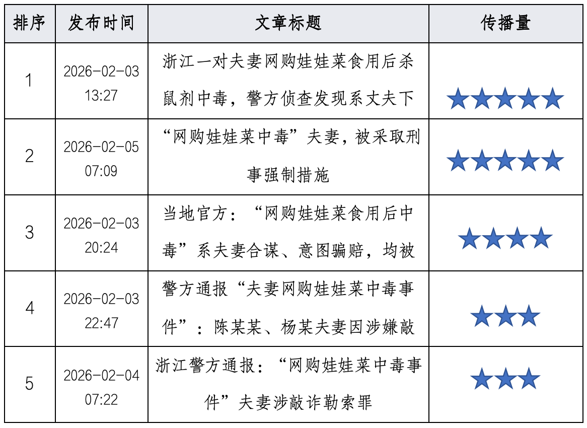 2026年02月03日00时至2026年02月05日10时,境内有关“浙江夫妻网购娃娃菜食用中毒事件”的舆情信息主要传播平台为社交网络、新闻APP、短视频等。总体情感倾向以负面为主。其中,负面信息约占53.2%;中性信息约占40.1%;正面信息约占6.7%。舆情在02月03日达到最高峰。