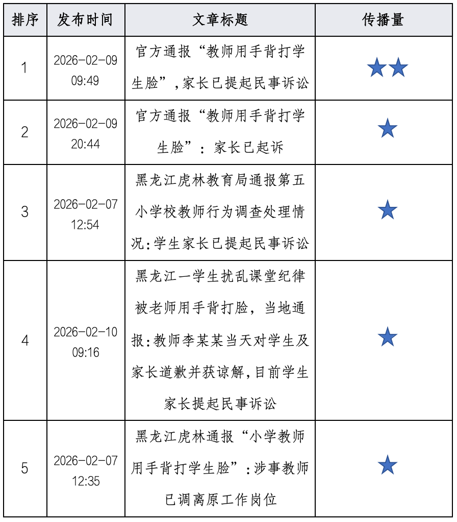 (一)关注事件处理过程的官方通报据【央视网】、【环球网】、【九派新闻】报道,媒体集群的核心焦点在于完整、客观地转述虎林市教育局发布的官方通报内容。这些报道详细梳理了事件的时间线:从2025年9月22日教师李某某因学生扰乱课堂秩序而动手,并当天道歉获谅解;到同年11月家长报案,警方于2026年2月作出不予行政处罚决定;再到教育部门早在2025年12月已对涉事教师作出党内警告处分并调离原岗位。该集群的报道立场中立,侧重于呈现官方调查结果和已采取的行政措施,同时提及了事件的最新进展,即家长方已提起民事诉讼并对警方决定申请行政复议,为公众提供了权威的事件全貌。