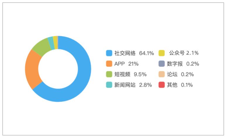 该时段内,境内有关“2026米兰冬奥会开幕”的舆情主要集中在社交网络平台,相关舆情量约占总量的64.1%,其次为新闻APP约占21.0%,短视频约占9.5%。