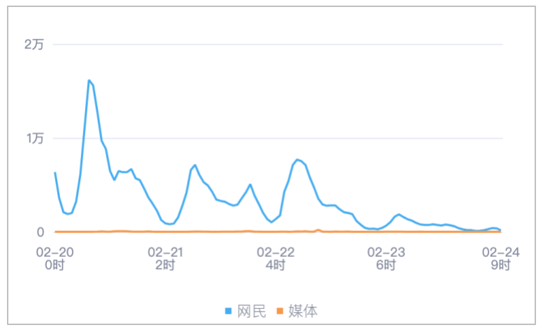 该时段内,境内有关“福建两学生帮扶老人遭索赔”的舆情信息,媒体舆情于02月22日14时达到最高峰,网民舆情于02月20日08时达到最高峰。