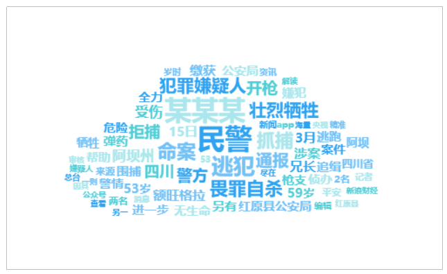 由上图可以看出,有关“四川阿坝一民警抓捕命案逃犯时牺牲”的话题提及频次较高的词语有“民警”、“某某某”、“逃犯”、“命案”、“抓捕”等。