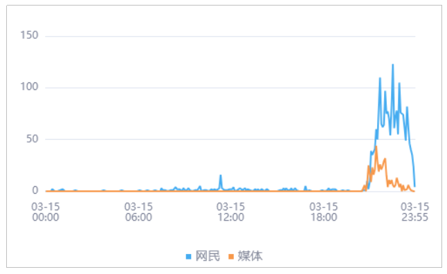 由上图趋势可以看出,有关“四川阿坝一民警抓捕命案逃犯时牺牲”的媒体舆情于03月15日21时25分达到最高峰,网民舆情于03月15日22时30分达到最高峰。