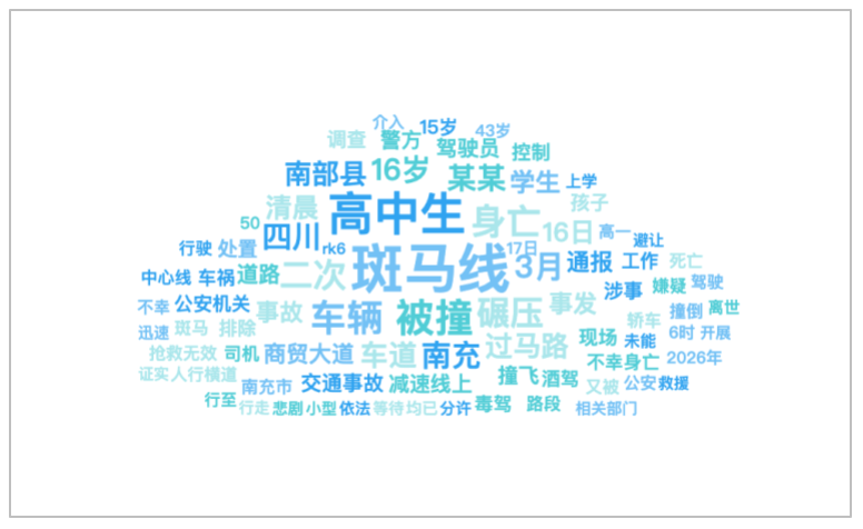 该时段内,有关“四川南充一高中生过马路被撞身亡”的话题提及频次较高的词语有“斑马线”、“高中生”、“被撞”、“车辆”、“身亡”等。