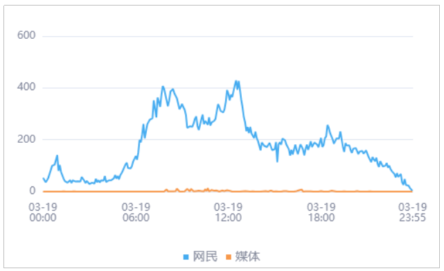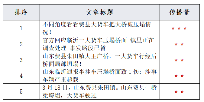 由上图趋势可以看出,有关“山东临沂一货车压塌桥面”的媒体舆情于03月19日10时40分达到最高峰,网民舆情于03月19日12时30分达到最高峰。