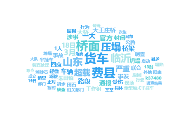 由上图可以看出,有关“山东临沂一货车压塌桥面”的话题提及频次较高的词语有“货车”、“桥面”、“费县”、“压塌”、“山东”等。