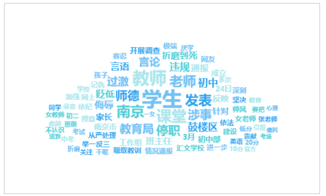 由上图可以看出,有关“南京一教师被指课堂上贬低学生”的话题提及频次较高的词语有“学生”、“教师”、“课堂”、“南京”、“老师”等。