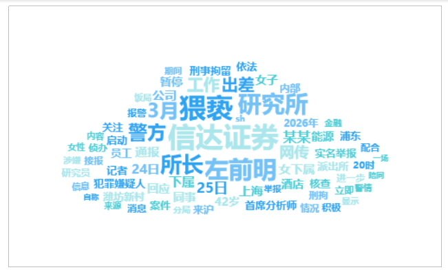 由上图可以看出,有关“一女子来沪出差时遭同事猥亵”的话题提及频次较高的词语有“信达证券”、“猥亵”、“左前明”、“研究所”、“所长”等。