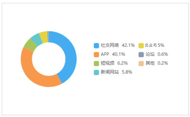 由上图可以看出,有关“一女子来沪出差时遭同事猥亵”的舆情主要集中在社交网络平台,相关舆情量,占总量的42.1%,其次为新闻APP占40.1%,短视频占6.2%。