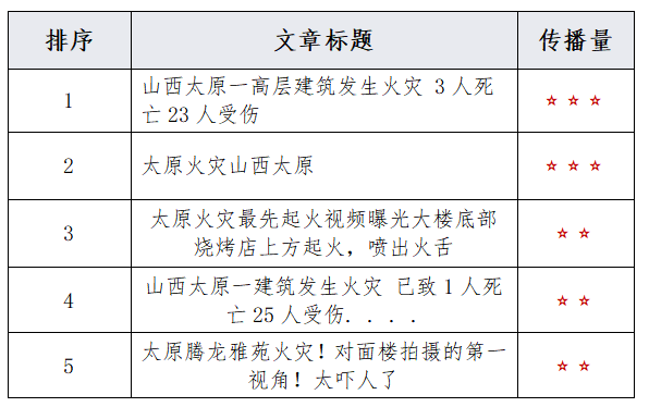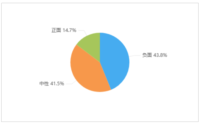 由上图可以看出,有关“太原一高层建筑发生火灾”的舆情中,负面情感倾向的舆情占比最多,达43.8%;中性舆情占比次之,为41.5%;正面舆情占比较少,仅占14.7%。