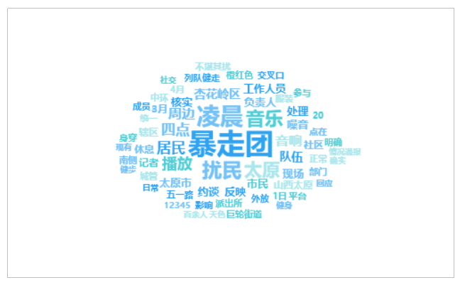 由上图可以看出,有关“太原暴走团凌晨四点播放音乐扰民”的话题提及频次较高的词语有“暴走团”、“凌晨”、“扰民”、“音乐”、“太原”等。