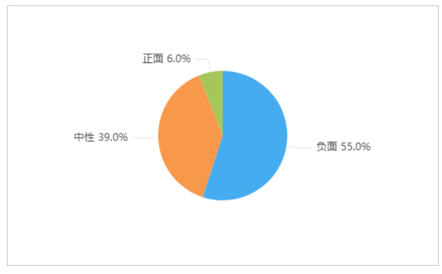 由上图可以看出,有关“太原暴走团凌晨四点播放音乐扰民”的舆情情感倾向中,负面舆情占比最多,达55.0%;其次是中性舆情,占39.0%;正面舆情较少,仅占6.0%。