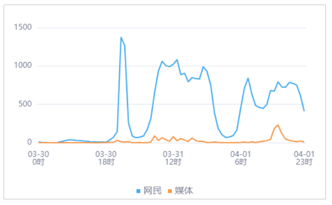 由上图趋势可以看出,有关“太原暴走团凌晨四点播放音乐扰民”的媒体舆情于04月01日16时达到最高峰,网民舆情于03月30日22时达到最高峰。