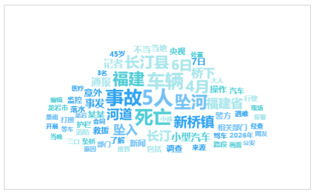 由上图可以看出,有关“福建一车辆坠河致5人死亡”的话题提及频次较高的词语有“5人”、“车辆”、“死亡”、“事故”、“坠河”等。