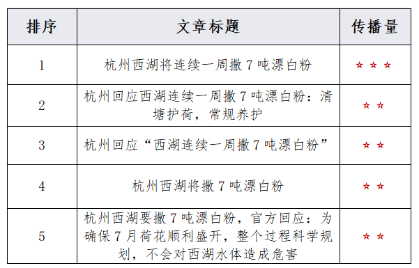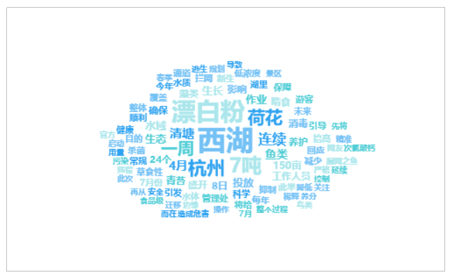 由上图可以看出,有关“西湖连续一周撒7吨漂白粉”的话题提及频次较高的词语有“西湖”、“漂白粉”、“7吨”、“杭州”、“荷花”等。
