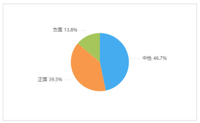由上图可以看出,有关“西湖连续一周撒7吨漂白粉”的舆情情感倾向中,中性舆情占比最多,为46.7%;其次是正面舆情,占比39.5%;负面舆情较少,占比13.8%。