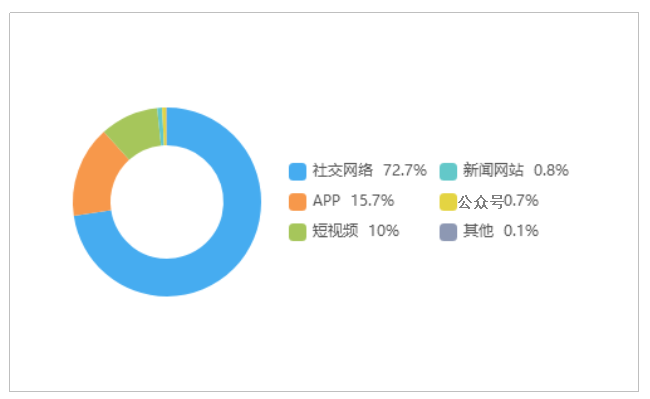 由上图可以看出,有关“西湖连续一周撒7吨漂白粉”的舆情主要集中在社交网络平台,相关舆情量,占总量的72.7%,其次为新闻APP占15.7%,短视频占10.0%。