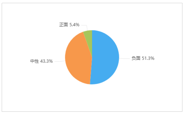 由上图可以看出,有关“一奥迪车在合肥加完油后逃单”的舆情中,负面情感倾向的舆情占比最多,达51.3%;中性舆情次之,占比43.3%;正面舆情较少,仅占5.4%。