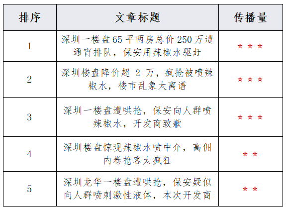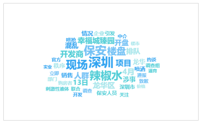由上图可以看出,有关“深圳一楼盘保安喷辣椒水驱散买房人群”的话题提及频次较高的词语有“深圳”、“保安”、“辣椒水”、“现场”、“楼盘”等。