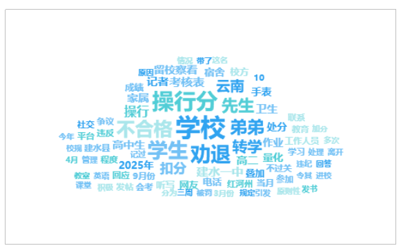 由上图可以看出,有关“云南高中生因操行分被劝退”的话题提及频次较高的词语有“学校”、“操行分”、“劝退”、“学生”、“不合格”等。
