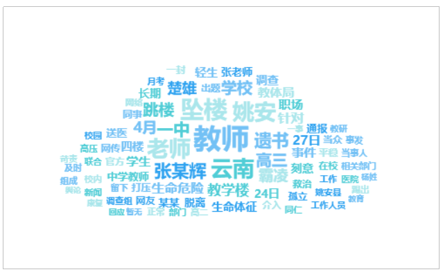 由上图可以看出,有关“云南楚雄一中学教师在校内坠楼”的话题提及频次较高的词语有“教师”、“坠楼”、“云南”、“姚安”、“老师”等。
